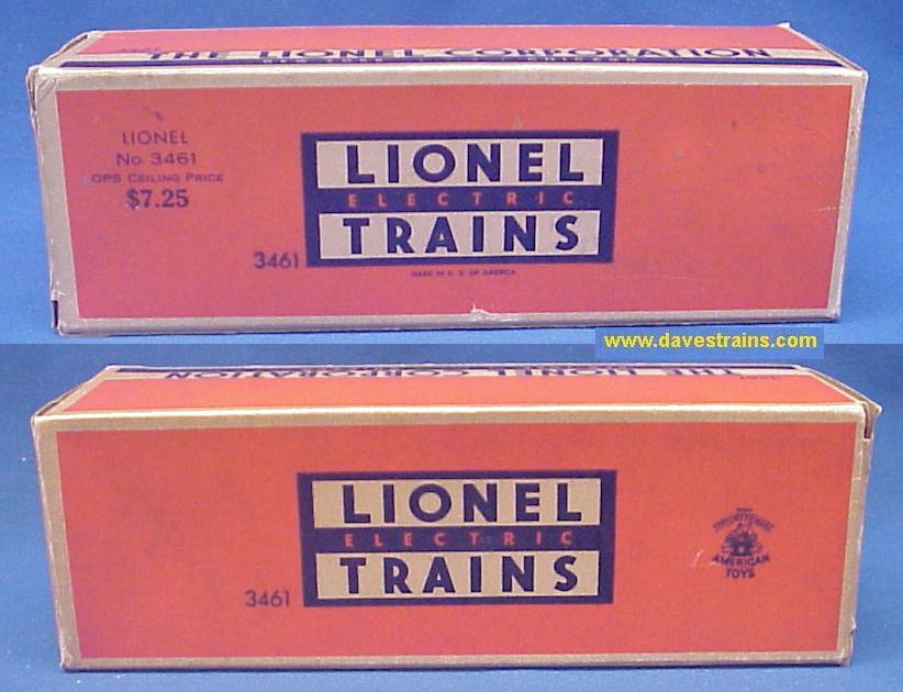 Photo. Box flaws: small tears, minor creases. Another view of the box. Has the preprinted Office of Price Stabilization information on one side of the box. Two more views of the box. Has the elaborate insert (liner)! Photo of the insert. This brick-like box is SOLID: clean, complete, square and sturdy -- plus there is no tape anywhere! It will likely represent an upgrade for most collectors. Another view of the insert. This is the larger (3 3/8 by 10 3/8 by 3 1/4 inch) box indicating that the piece was a separate sale item that also included a #160 unloading bin. This is the first 3461 OPS Classic box we have ever had available for separate sale! |