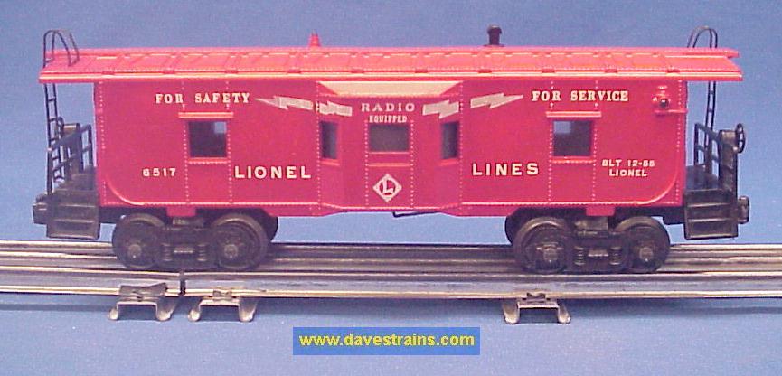 The Bay Window caboose was the largest caboose offered by Lionel in the postwar era. It only came as a deluxe model with interior lighting, fancy passenger car-type trucks, operating couplers, ladders & a die-cast smokestack. The 6517 caboose was made from 1955 to 1959 but the "Late Classic" box and the lack of underscoring on the car body date this piece as a 1956-59 item.