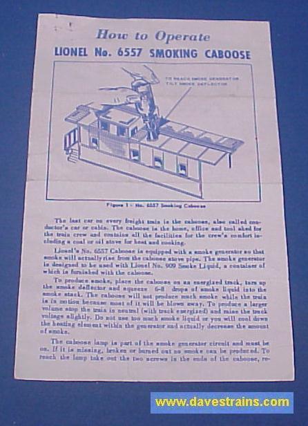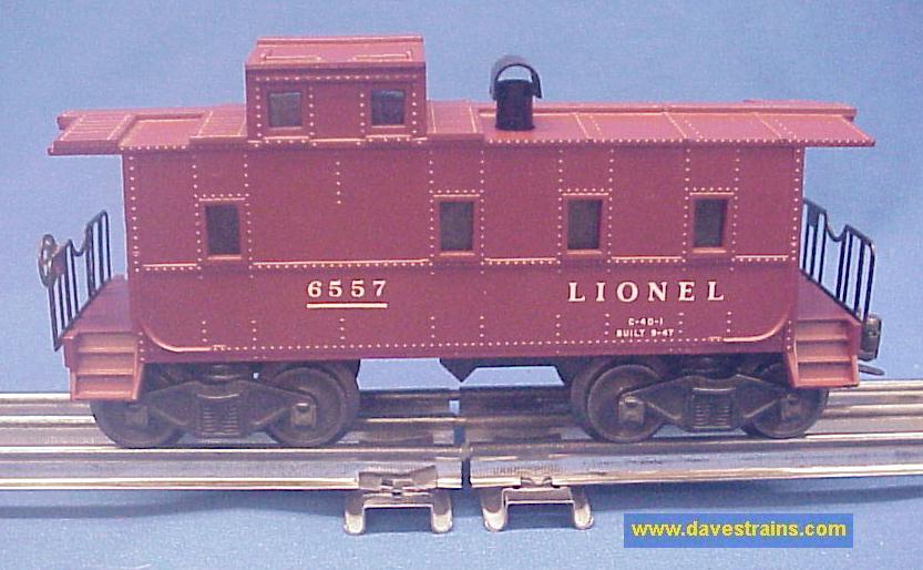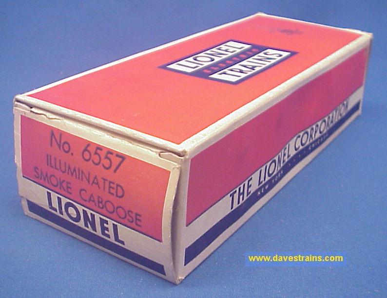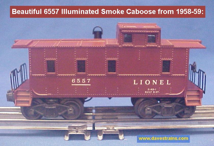 The illuminated, Tuscan-painted "LIONEL" SP-type smoking caboose from 1958-59: has white, heat-stamped lettering (with "6557" on the left) and the original smoke deflector plus bar-end trucks with single operating tab coupler.