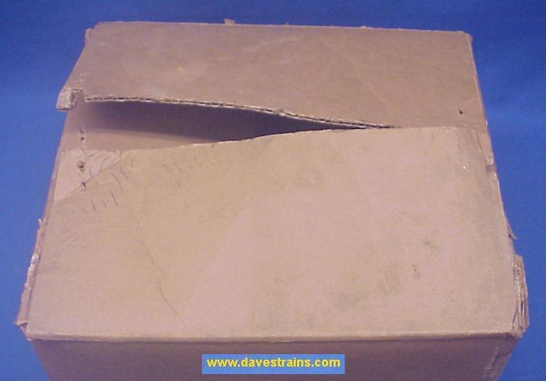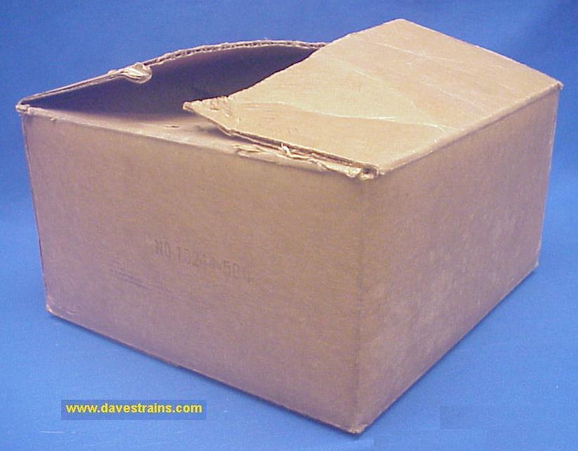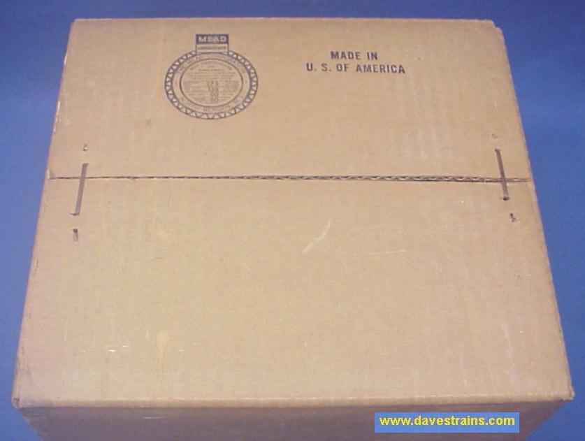 A small plain Mead Containers Corporation two-tier corrugated box with black printing. Has the original cardboard divider provided to separate the track placed on the bottom level from the engine, tender and cars placed on the top level. Close-up of the outfit number on one side. Has some tears, creases, minor stains and holes from the removal of the metal staples plus a little distortion. Photo of the top of the box. Some flaws but this box is very presentable as it is fairly clean and sturdy plus there is no tape anywhere! Photo of the bottom of the box. |