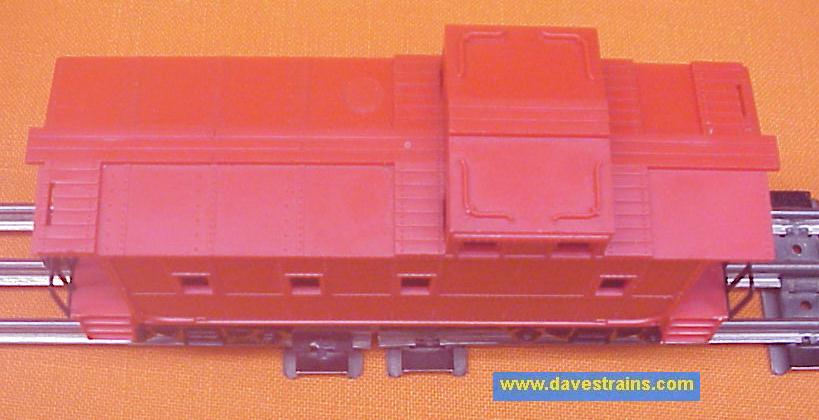 Photo of the other side. Nothing! So here we have an unmarked, unpainted red SP-type caboose with middle AAR trucks and one fixed coupler. Photo of the roof. Minimal flaws! The caboose is completely intact and very, very clean! |