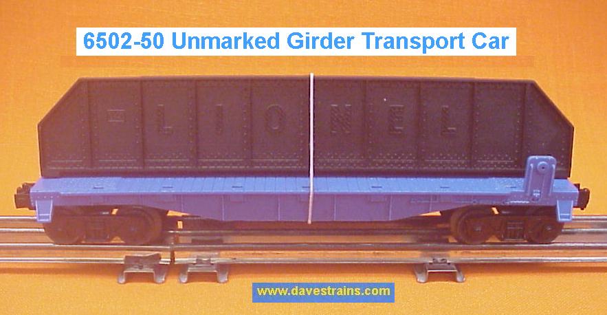 Unmarked, unpainted blue flatcar with the correct ORIGINAL (black) "LIONEL" Girder. Flat has mold #6511-2 plus early AAR trucks with fixed couplers. Listed by Lionel in their service manuals as the "6502 Steel Girder Transport Car" although recent research shows internal Lionel documentation listing this car as "6502-50" reflecting the blue color of the flat, the lack of a brakewheel plus the truck & coupler combination.