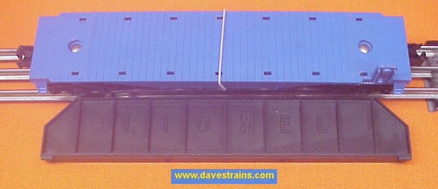 Photo of the other side. Just gorgeous: very, very clean with nice, shiny, rust-free truck rivets. Has the original elastic tie down band. Photo showing the car's decking and the outside of the girder. Has the correct girder: black molded and with "LIONEL" in raised lettering but no other no decoration. Nice car that is very, very unusual! Check your collection -- this is not an easy car to find. |