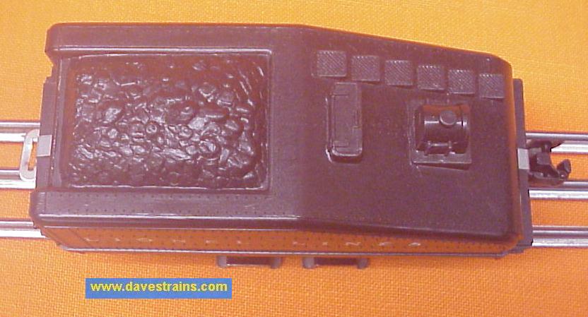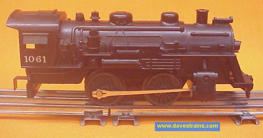 Photo of the left side of the loco. Loco: traction tire and white, heat-stamped numbering. Photo of the right side of the loco. Minimal flaws: completely intact with nice side rods & clean, crisp white, heat-stamped numbering! Photo of the front of the loco. The 1061's cab interior is very detailed with simulated gauges, piping, levers and firebox. Photo of the cab interior. This low-mileage loco was serviced and it runs great! An "aerial" view of the loco. Photo of left side the tender. The slope-back 4-wheel tender has white, heat-stamped lettering. plus late AAR trucks with a fixed coupler. Photo of the right side of the tender. Some surface scratches and that's it for flaws! It is all intact and very clean with strong lettering! An "aerial" view of the tender. |
