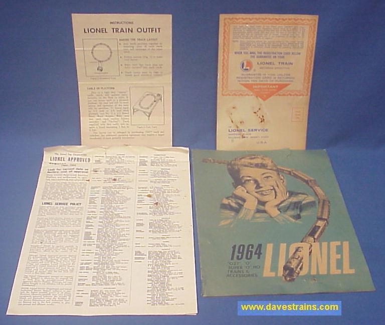 Includes the correct original operating instruction sheet: #11311-20 (dated 5/63) (grade 8 -- somewhat discolored) plus the original Warranty Card -- form #1-165 (creases, stains & discolored), the correct 1964-65 list of Lionel Approved Service Stations (creases and stains) and the 1964 Consumer Catalogue (creases, tears & holes). |