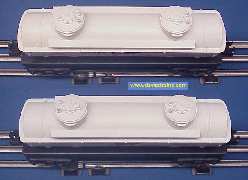 The only tank car from the "Space and Military Series:" a 2-dome tank car painted snow white with red rubber-stamped lettering & graphics plus a chemically-blackened frame. It is the version from 1962 with early AAR trucks and two operating couplers.
