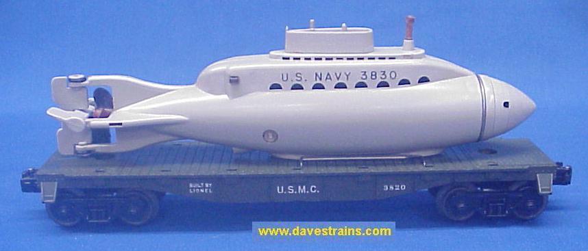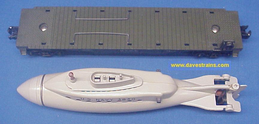 SOLD Olive-drab painted flatcar with the correct, ORIGINAL operating "U. S. NAVY 3830" submarine.
