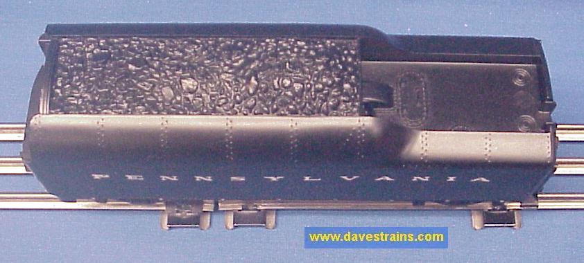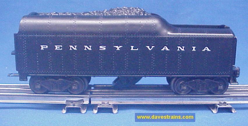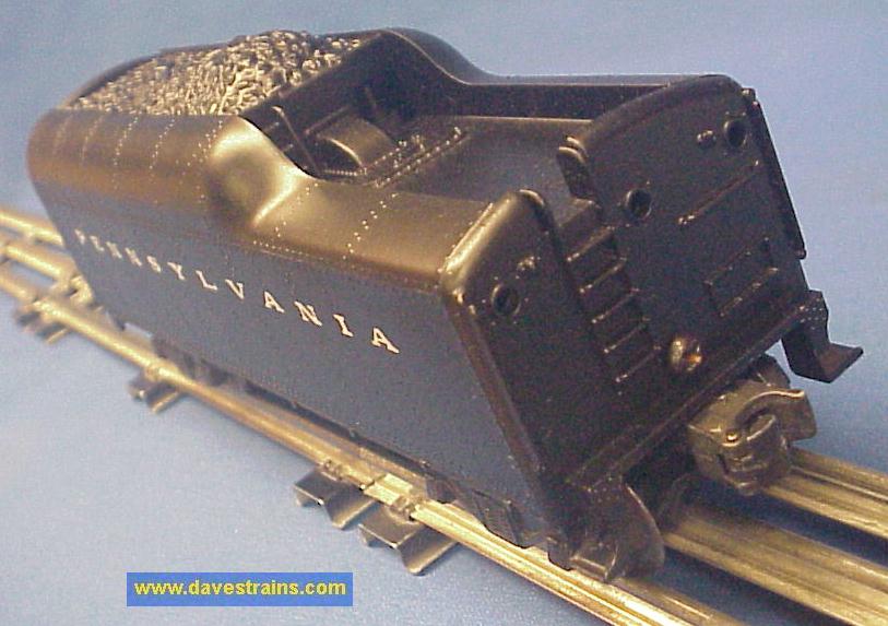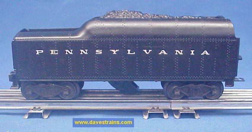 Correct "PENNSYLVANIA" scoop tender has open rear port holes on the deck end plus 4-wheel bar-end trucks with a magnetic coupler.
