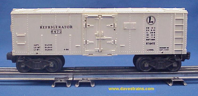 The 6472 is the non-operating version of the 3472 milk car. Note that the 1950 version of this car is much harder to find than the later 6472 reefers that came without frame steps.