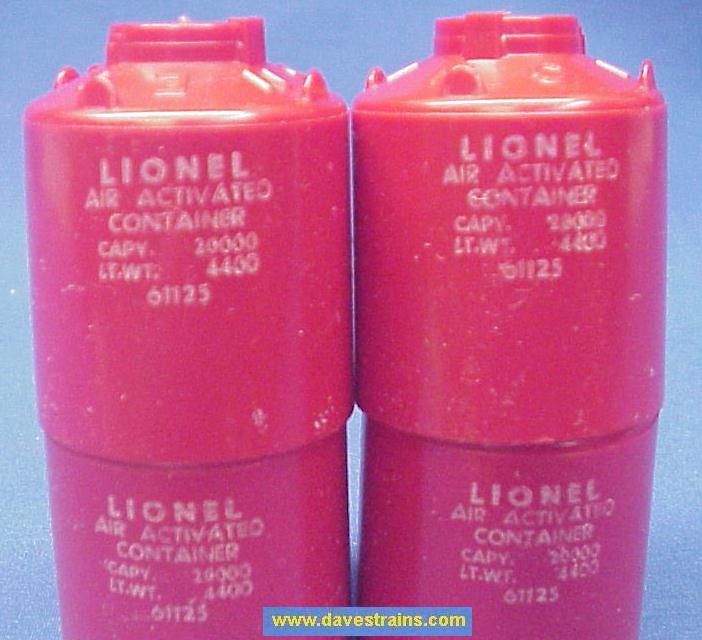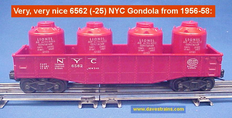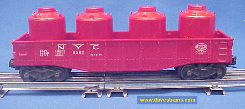 On Hold An unpainted red NYC long gondola from 1956-58: has white heat-stamped lettering and bar-end trucks with tab couplers. Has the correct original load: four red canisters with white lettering. Catalogued by Lionel as "6562-25" but the car is actually numbered "6562" on the sides.