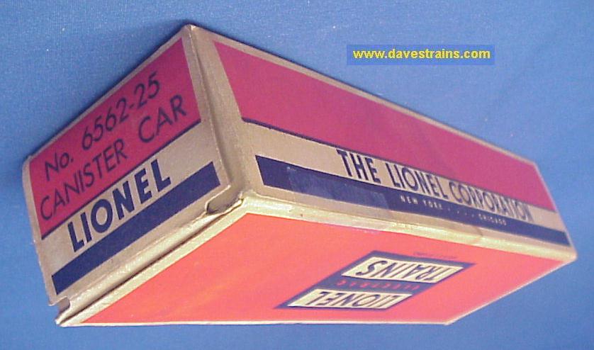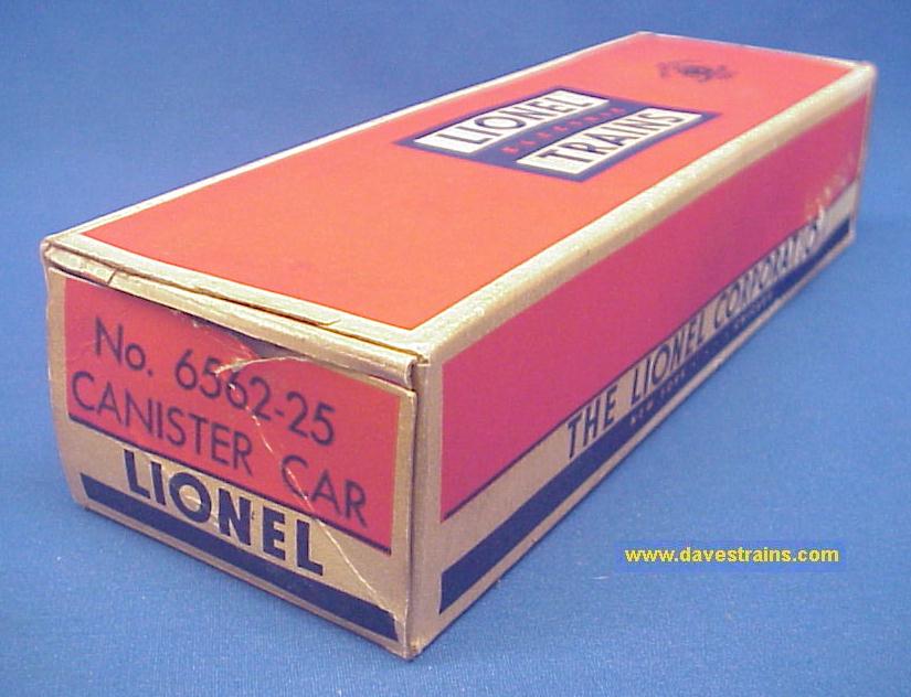A very, very nice car with original unbroken canisters in a hard-to-find box. We have had very few red 6562-25 gondolas over the years.