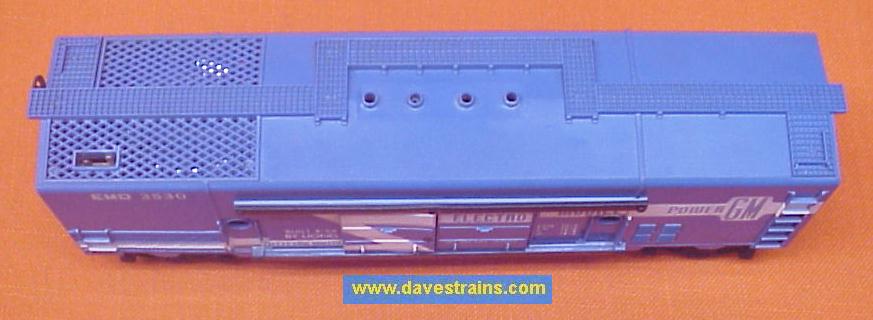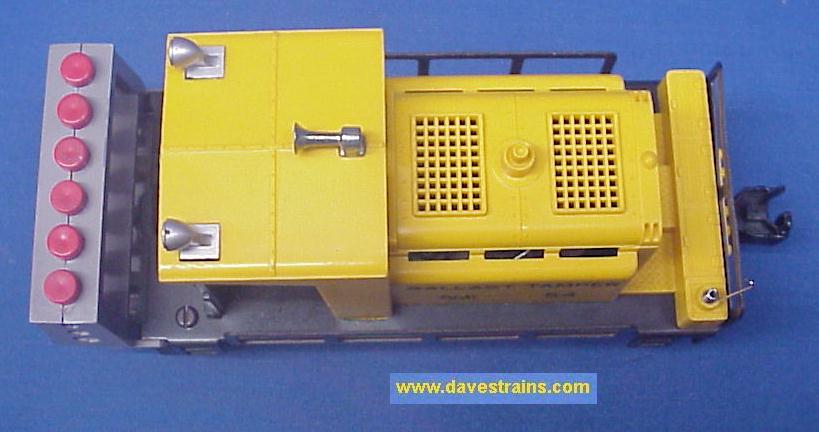 A sharp-looking motorized unit from 1960-62: has a black body with white lettering, plus a dark-gray brushplate cover and a light-gray platform.