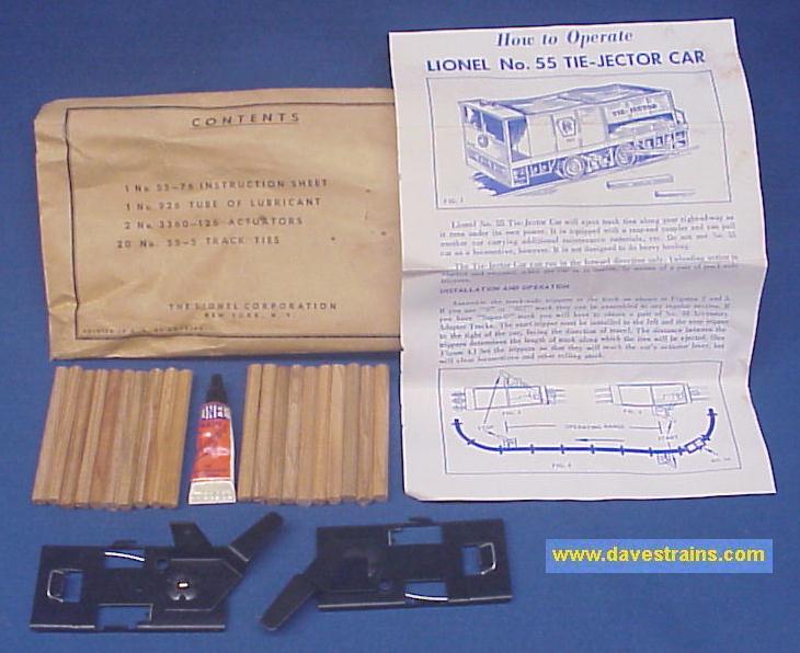 Has the original envelope #55-77 (wrinkled; tears) containing the #55-76 instruction sheet, dated 10/57 (tears & creases), two #3360-126 original actuators, the original tube of lubricant and twenty (20) original #55-5 track ties.