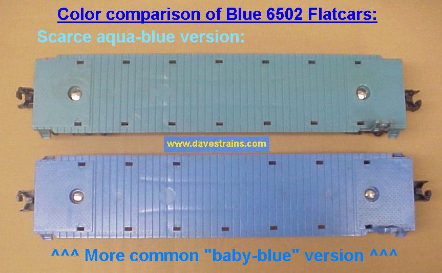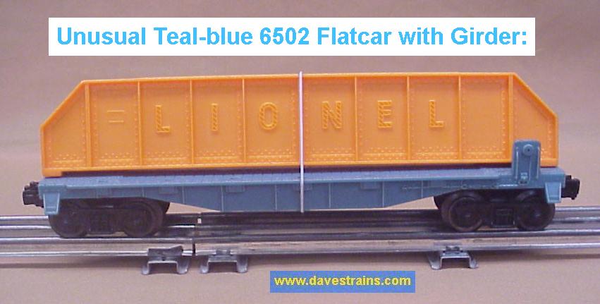 Flat has mold #6511-2 plus early AAR trucks with fixed couplers. Listed by Lionel in their service manuals as the "6502 Steel Girder Transport Car" although recent research shows internal Lionel documentation listing this car as "6502-50" reflecting the blue color of the flat, the lack of a brakewheel plus the truck & coupler combination.