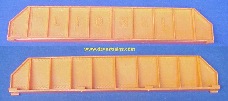 A very unusual item in a rare color: an unmarked, unpainted teal-blue flatcar from 1963-65 with the correct ORIGINAL (orange) "LIONEL" Girder.