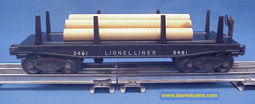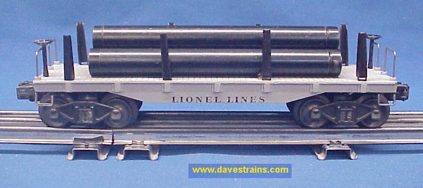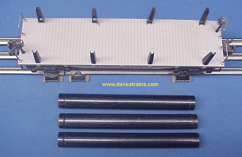 Black flatcar with white, heat-stamped lettering and a gray superstructure (rack): this car from 1956-57 has bar-end trucks with tab couplers and the correct count of six unused wheel sets.