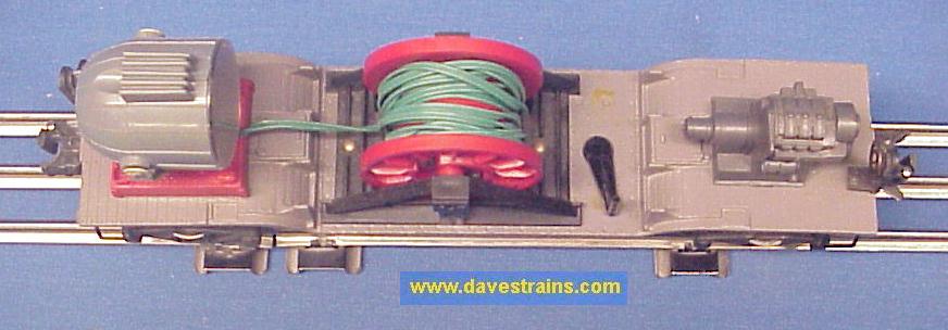 SOLD Gray-painted, die-cast, depressed-center flatcar from 1954-55: has black, rubber-stamped serif lettering plus bar-end trucks with magnetic couplers. Comes with the correct load of two original (harder-to-find) gray reels with the original aluminum wire.