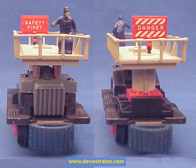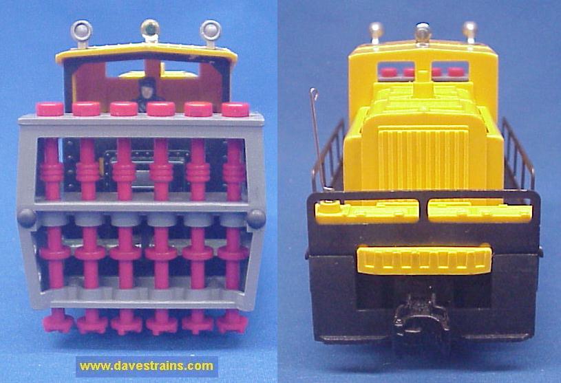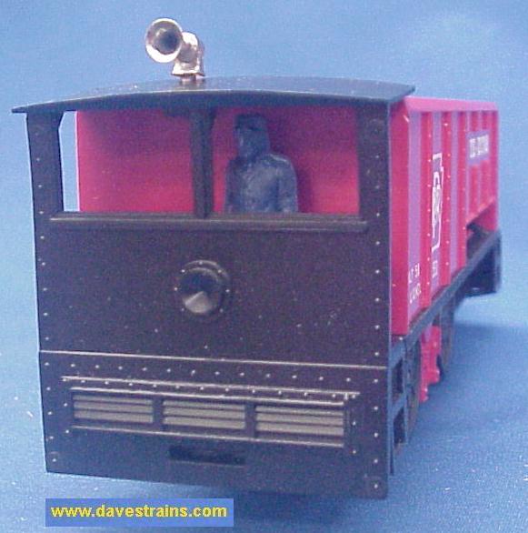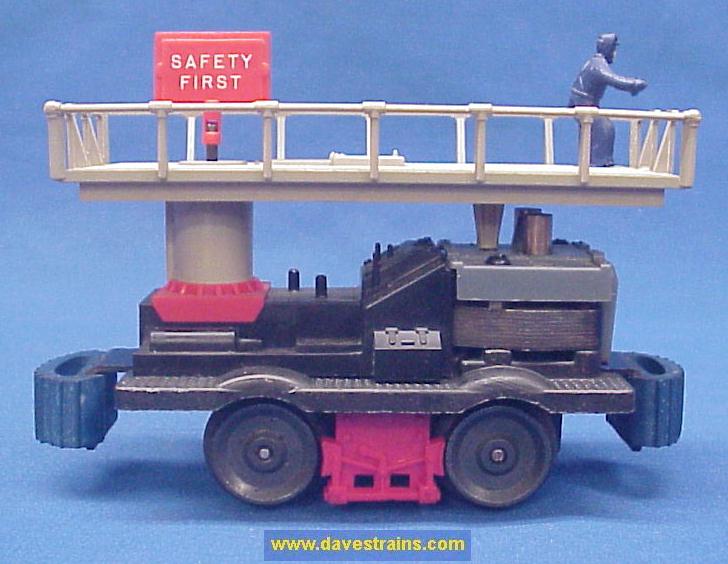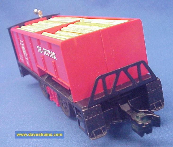 Has a black plastic frame, red cab, white heat-stamped lettering and bar-end trucks with tab couplers plus OPEN cranks and a straight hook.
