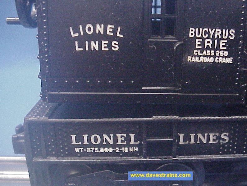 A good-looking black Bucyrus Erie Crane Car from 1954: has a die-cast frame, white lettering, bar-end (metal) trucks with magnetic couplers plus open cranks and the correct offset hook.